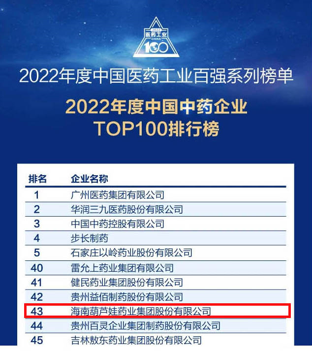 会议期间,一年一度的中国医药工业百强系列榜单隆重揭晓,鼎博药业集团凭借领先的研发优势和扎实的生产实力以及稳健的市场推广能力,连续第四年成功入选“2022年度中国中药企业TOP100排行榜” ,排名稳步上升至第43位。