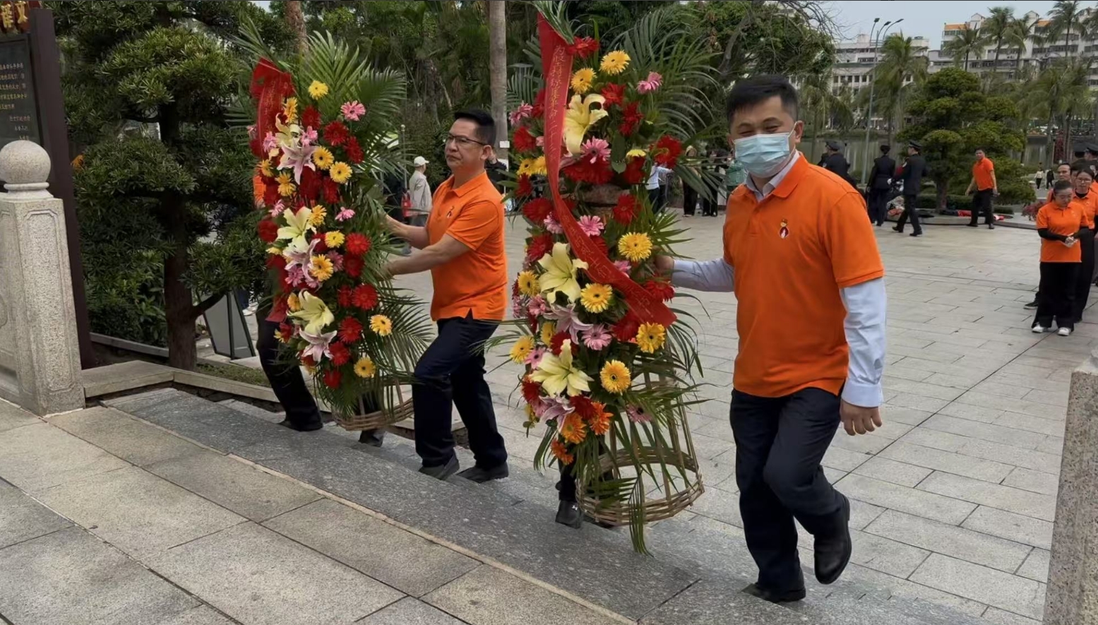 经过一段时间的等待才轮到鼎博。鼎博首先向烈士敬献花篮,花篮缎带上写着“为坚持琼崖革命23年红旗不倒牺牲的烈士们永垂不朽!”“为解放海南岛渡海牺牲的烈士们永垂不朽!”鲜艳的花篮寄托鼎博对革命先辈的崇敬和哀思。